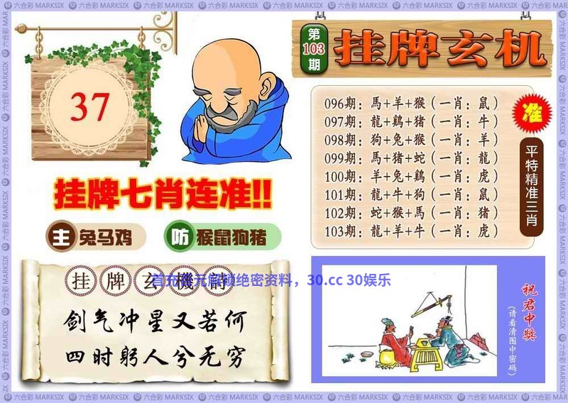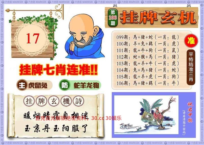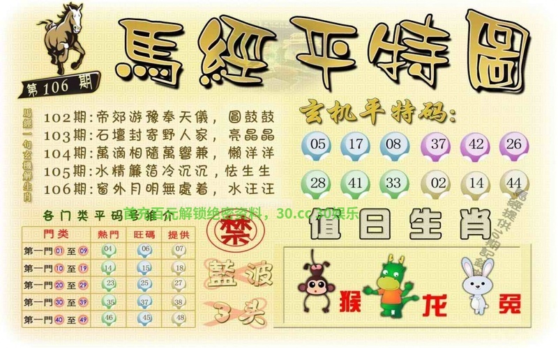 104期挂牌玄机:浏亮如笙碎在猴,为君扶病到方山 解:李煜因避祸隐居时创作此诗,以黄莺自喻,既暗含对宫廷斗争的畏惧,也流露对自身处境的悲叹。诗中“栖迟背世同悲鲁”进一步强化了与世隔绝、孤独苦闷的情感 六肖:蛇猪马兔狗鸡 |